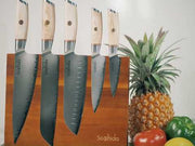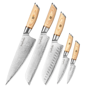 This Soshida Series 3-layer Composite Steel 5 Piece Chef Knife Set is a luxury set suitable for professional or personal use. Manufactured using composite forging, the surface is treated with Japanese-style mirror polishing and sandblasting.